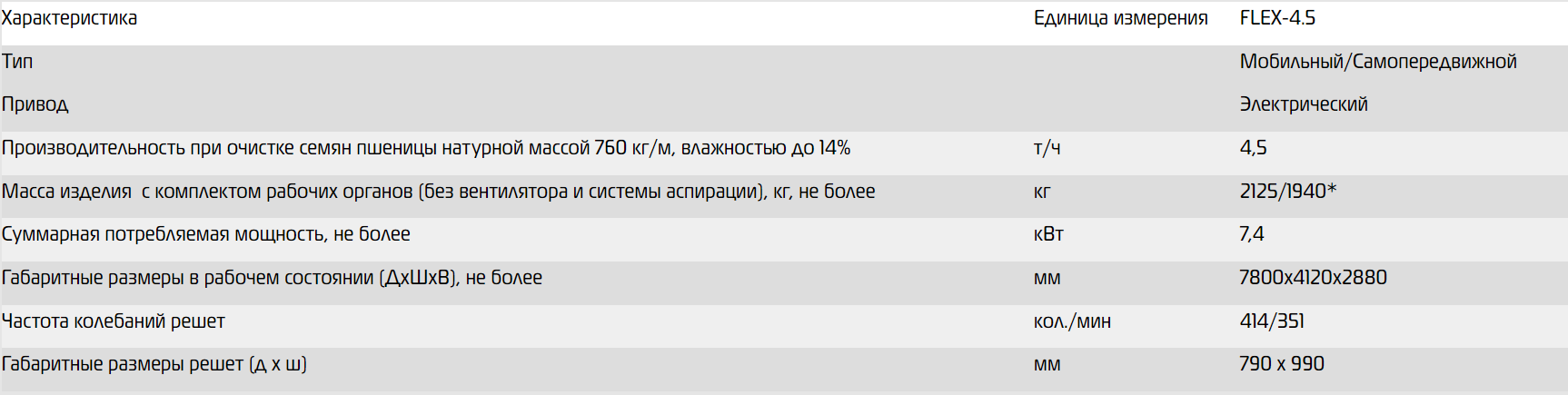 Машина FLEX-4.5 снабжена механизмом самопередвижения, обеспечивающим ее перемещение при выполнении технологического процесса. Очистка семян от посторонних примесей и дефектных семян очищаемой культуры производится воздушным потоком, по толщине и ширине – решетными полотнами, по длине - триерными цилиндрами. Машина состоит из двух питателей шнековых, транспортера загрузочного, рамы с ходом, стана решетного, аспирации, вибролотка, элеватора, цилиндров триерных, транспортера отгрузочного, электрооборудования, плиты с выключателями и ролика.